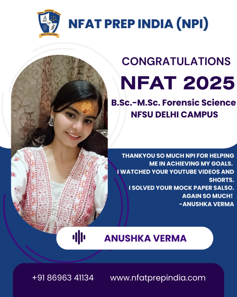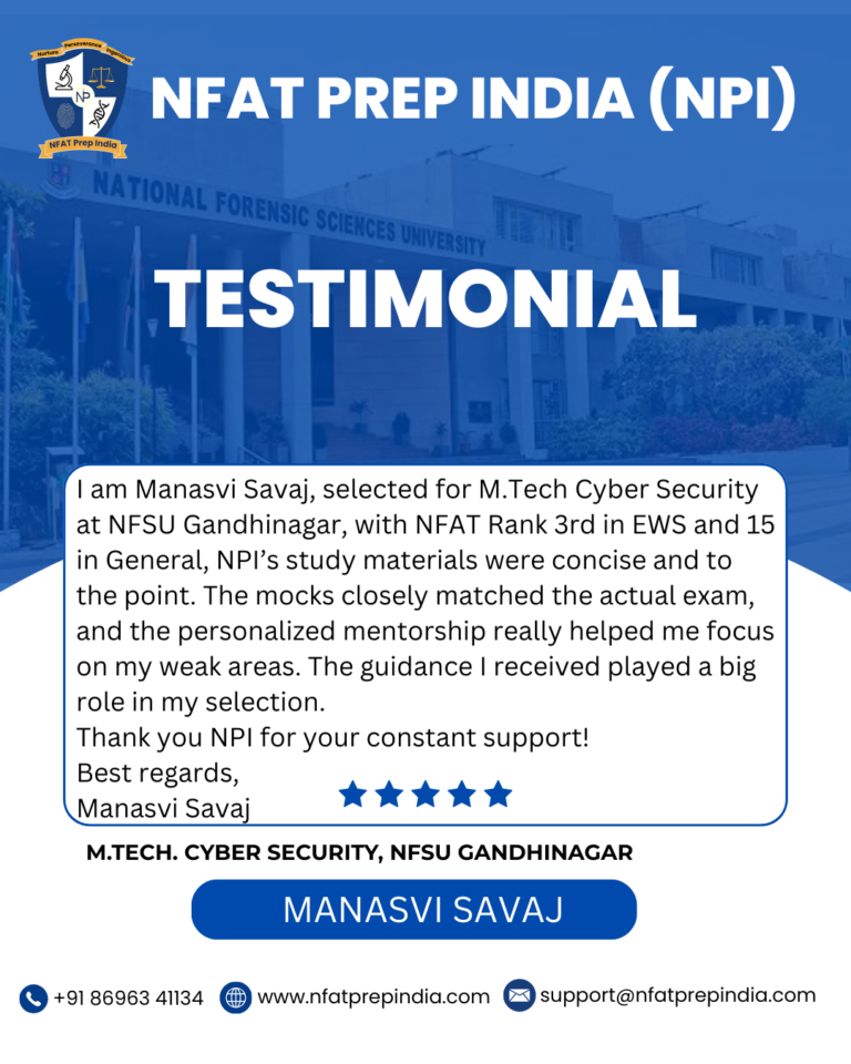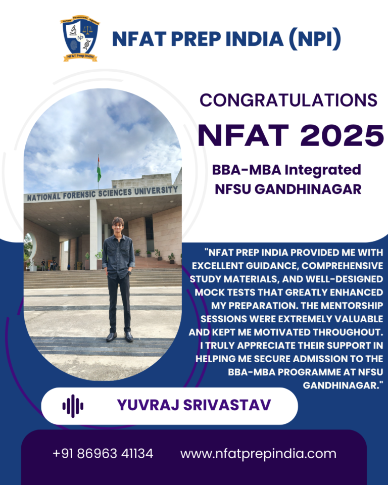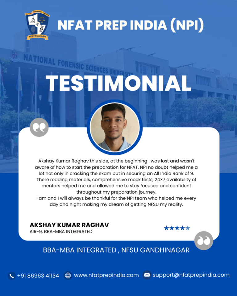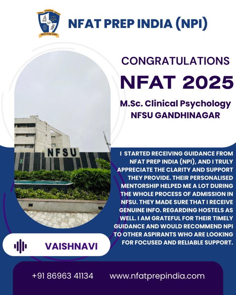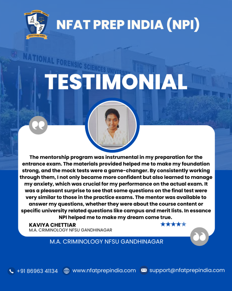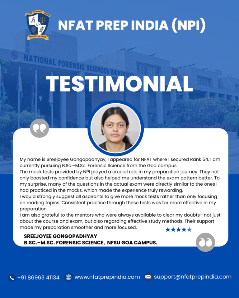 Hear from our students who have cracked the NFAT exam with the help of NFAT Prep India (NPI). Their experiences, challenges, and achievements will inspire you to stay focused and achieve your dream college (NFSU). Read their testimonials and see how our Mentorship Program, Mock Tests, and Expert Guidance have made a difference in their journey!Â