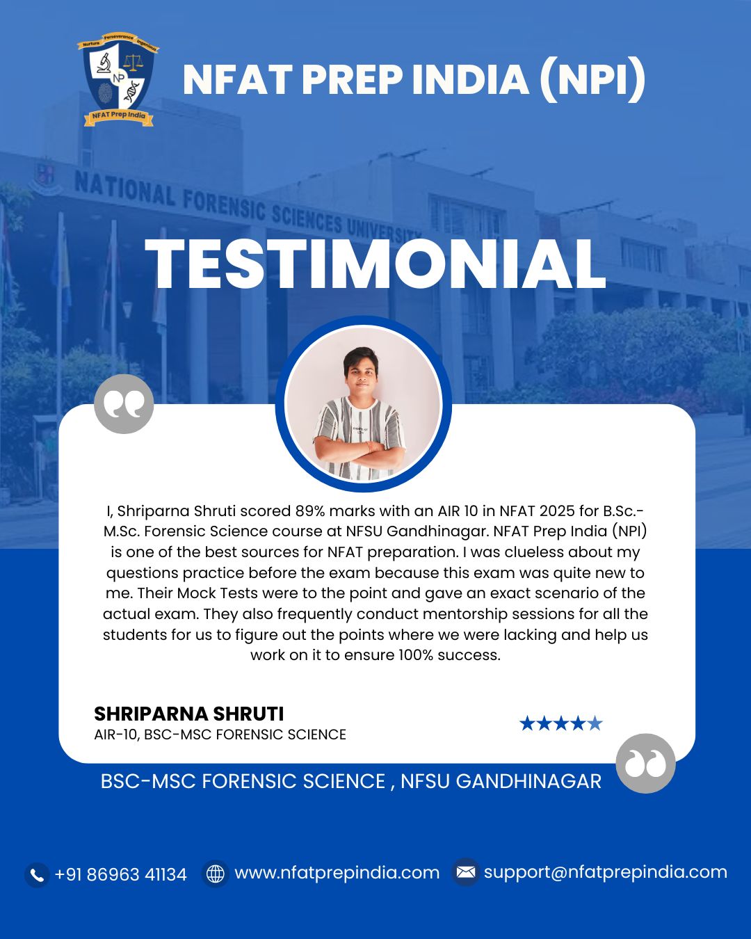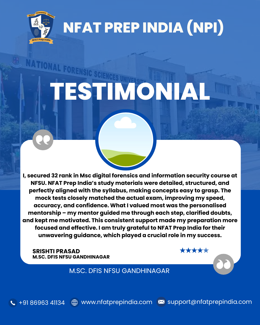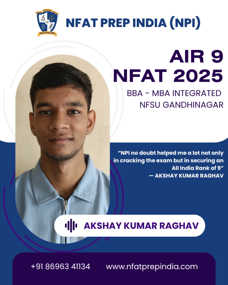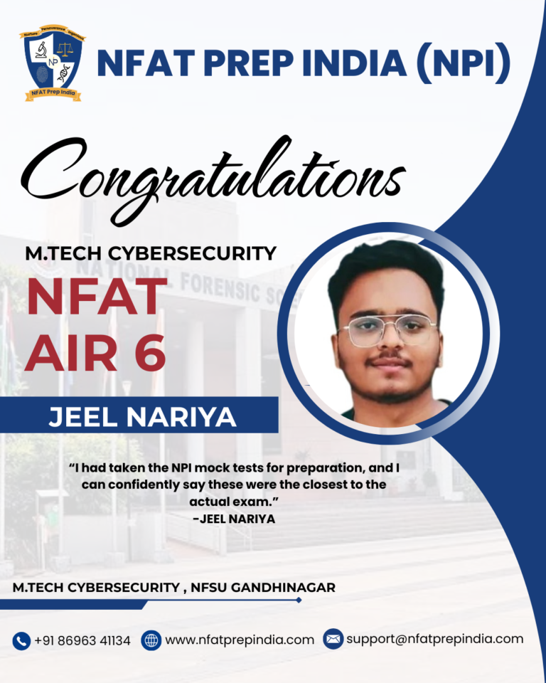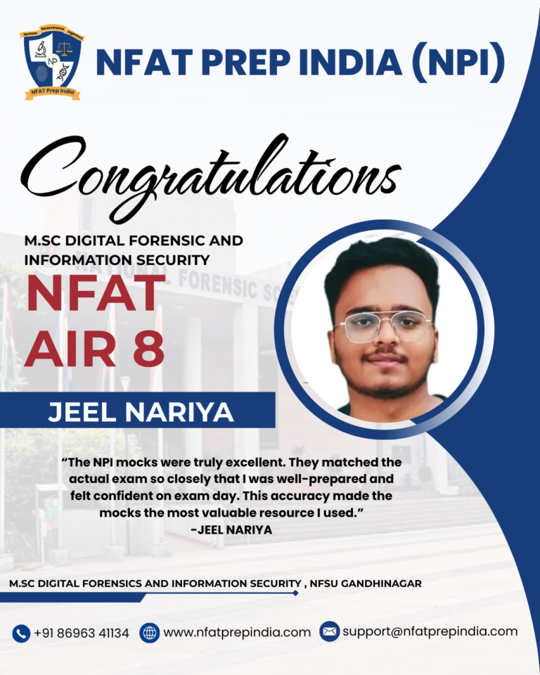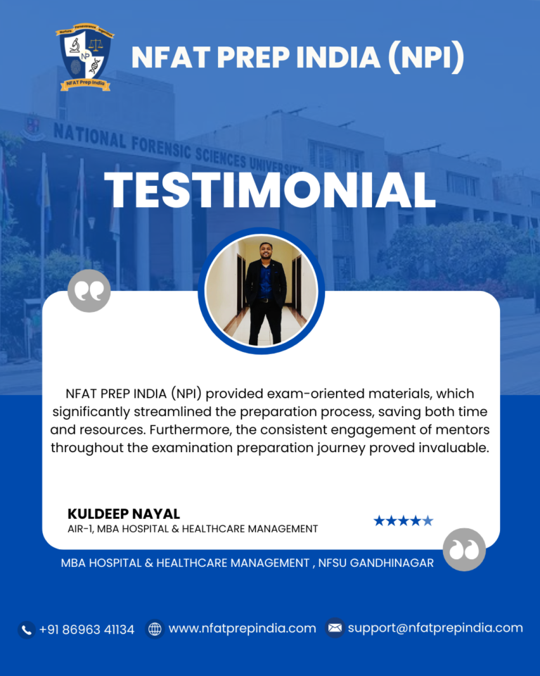 Hear from our students who have cracked the NFAT exam with the help of NFAT Prep India (NPI). Their experiences, challenges, and achievements will inspire you to stay focused and achieve your dream college (NFSU). Read their testimonials and see how our Mentorship Program, Mock Tests, and Expert Guidance have made a difference in their journey!Â