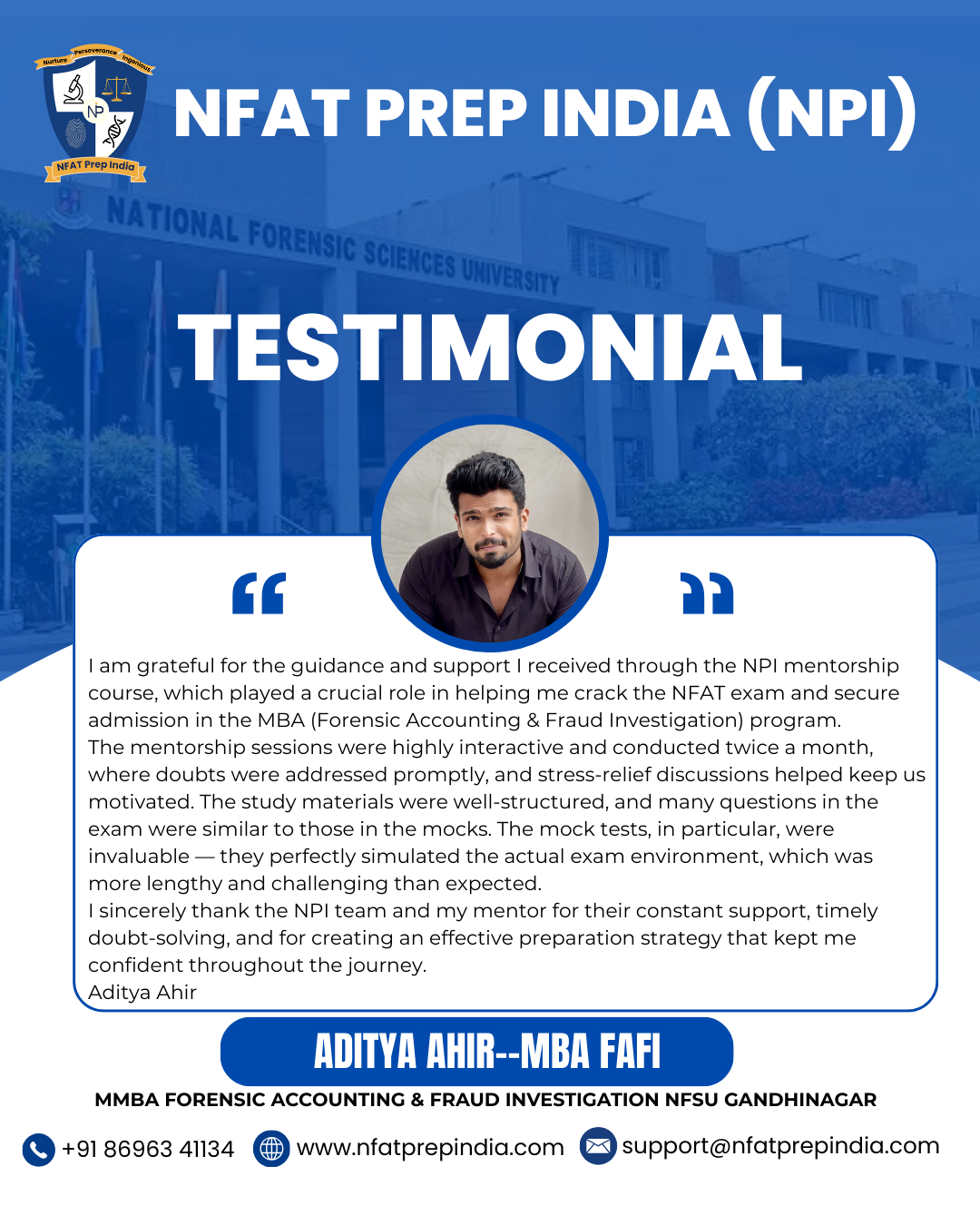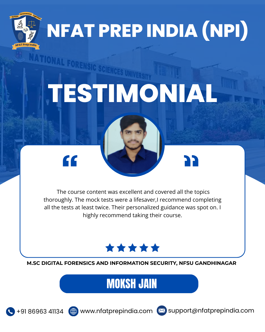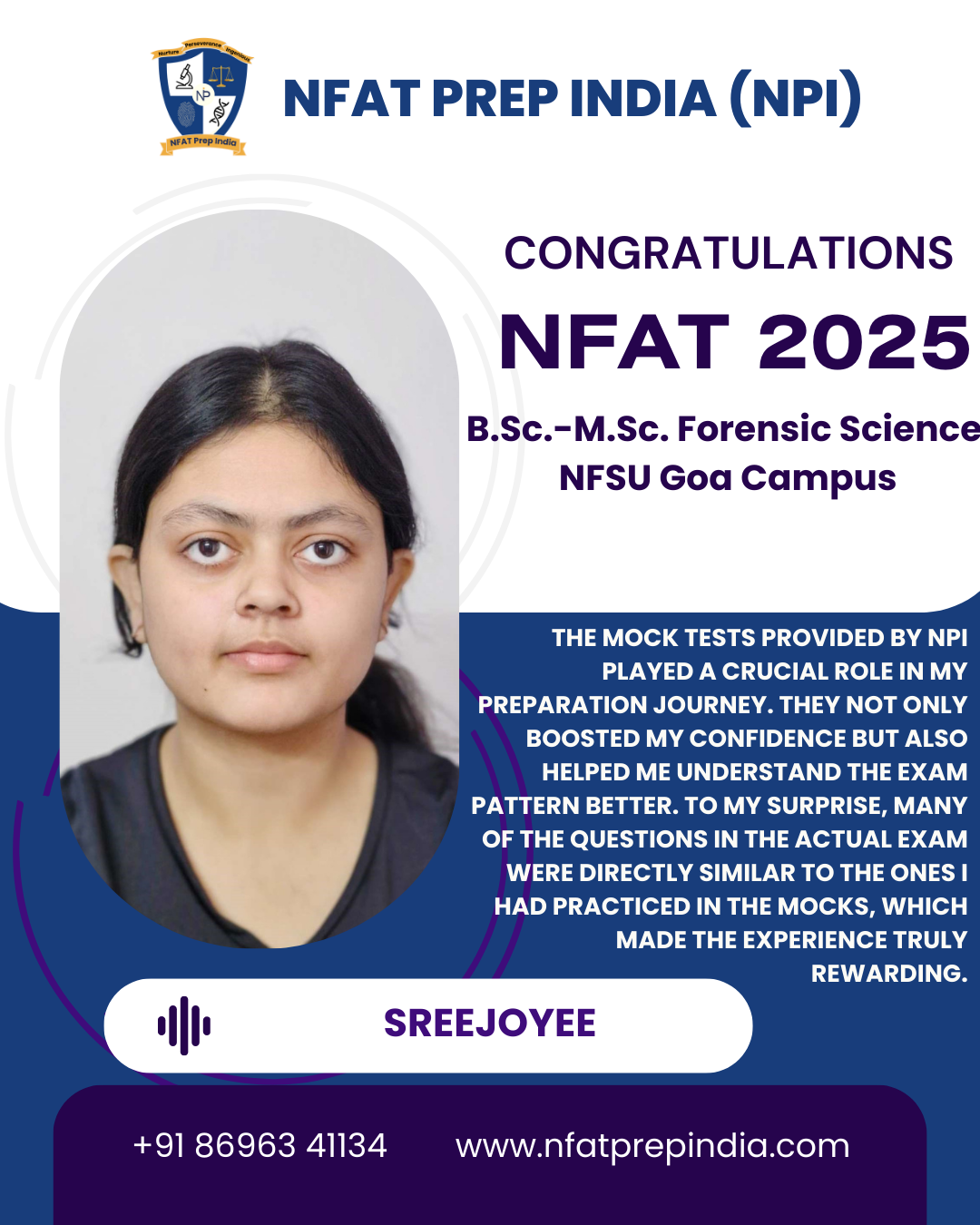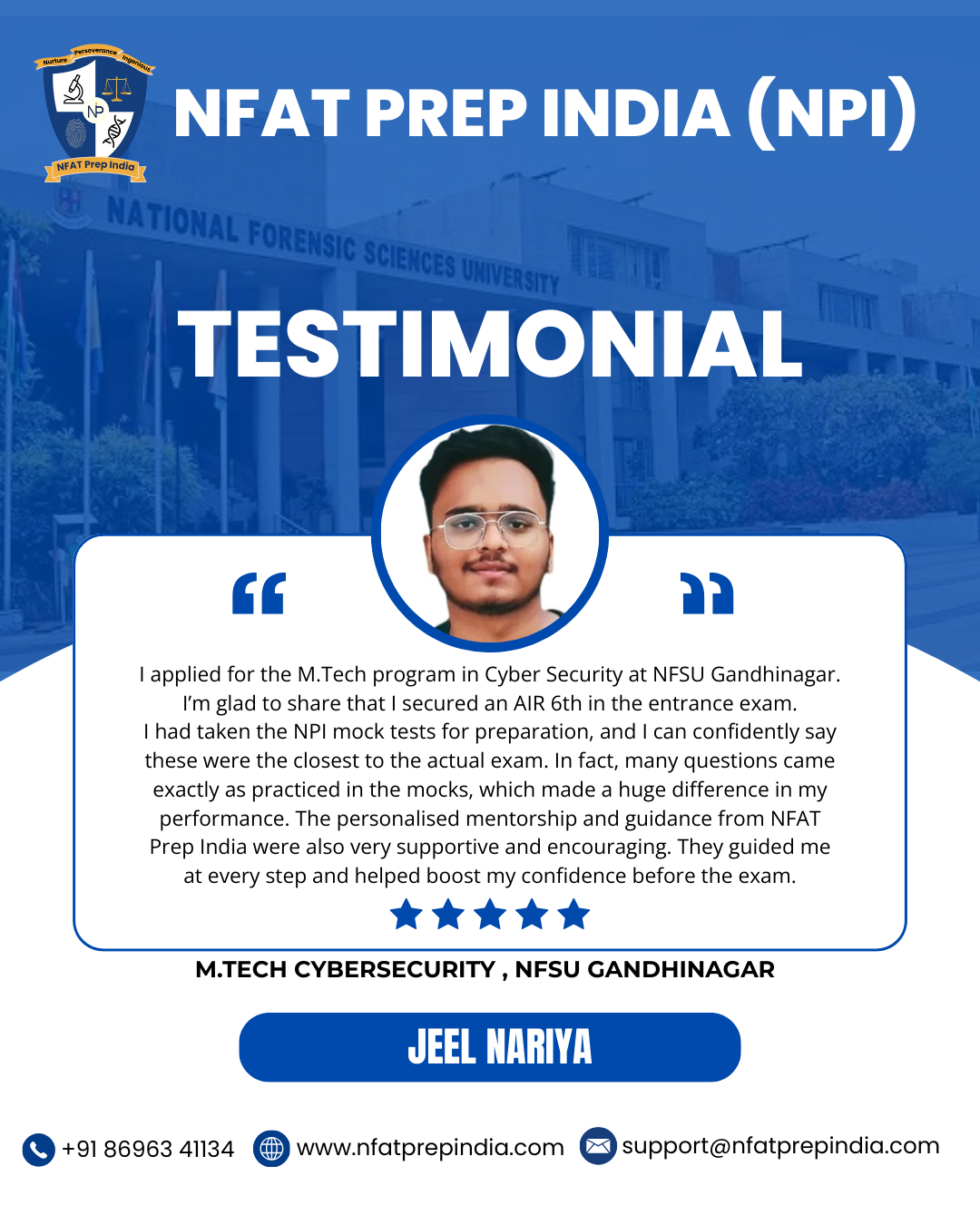 Hear from our students who have cracked the NFAT exam with the help of NFAT Prep India (NPI). Their experiences, challenges, and achievements will inspire you to stay focused and achieve your dream college (NFSU). Read their testimonials and see how our Mentorship Program, Mock Tests, and Expert Guidance have made a difference in their journey!Â