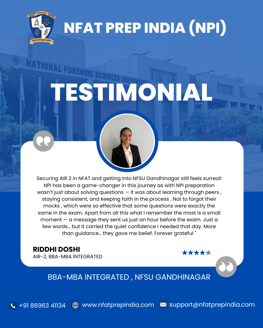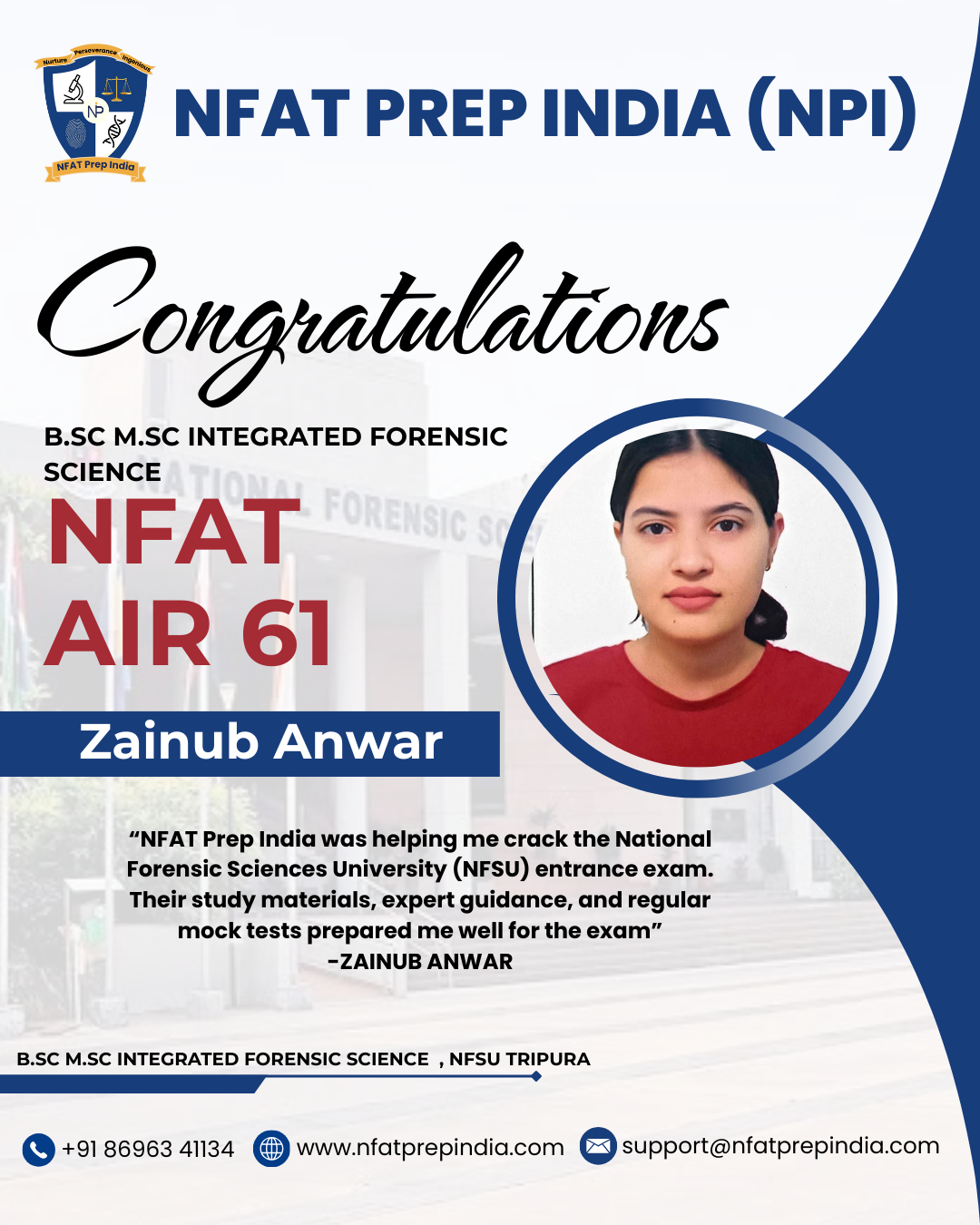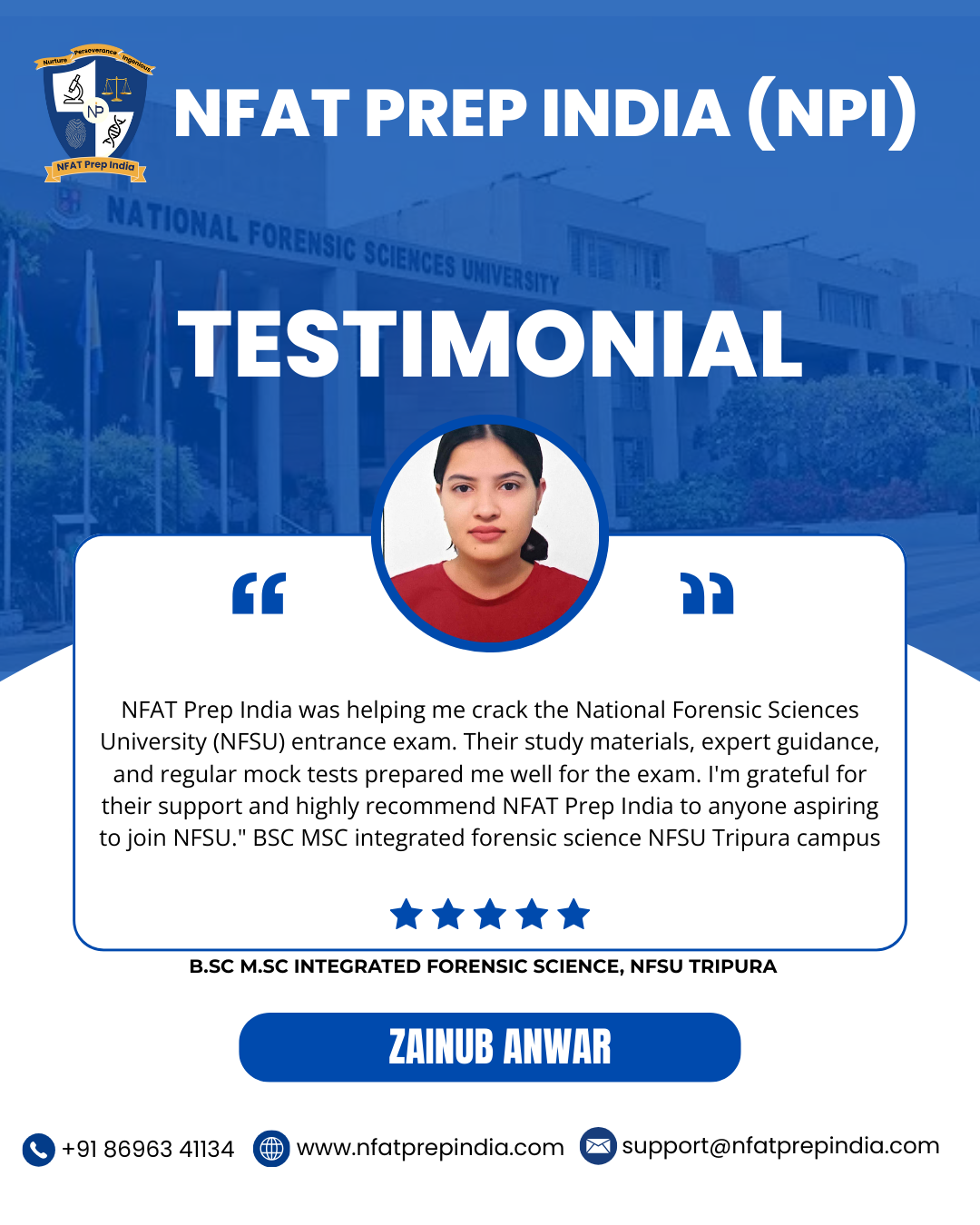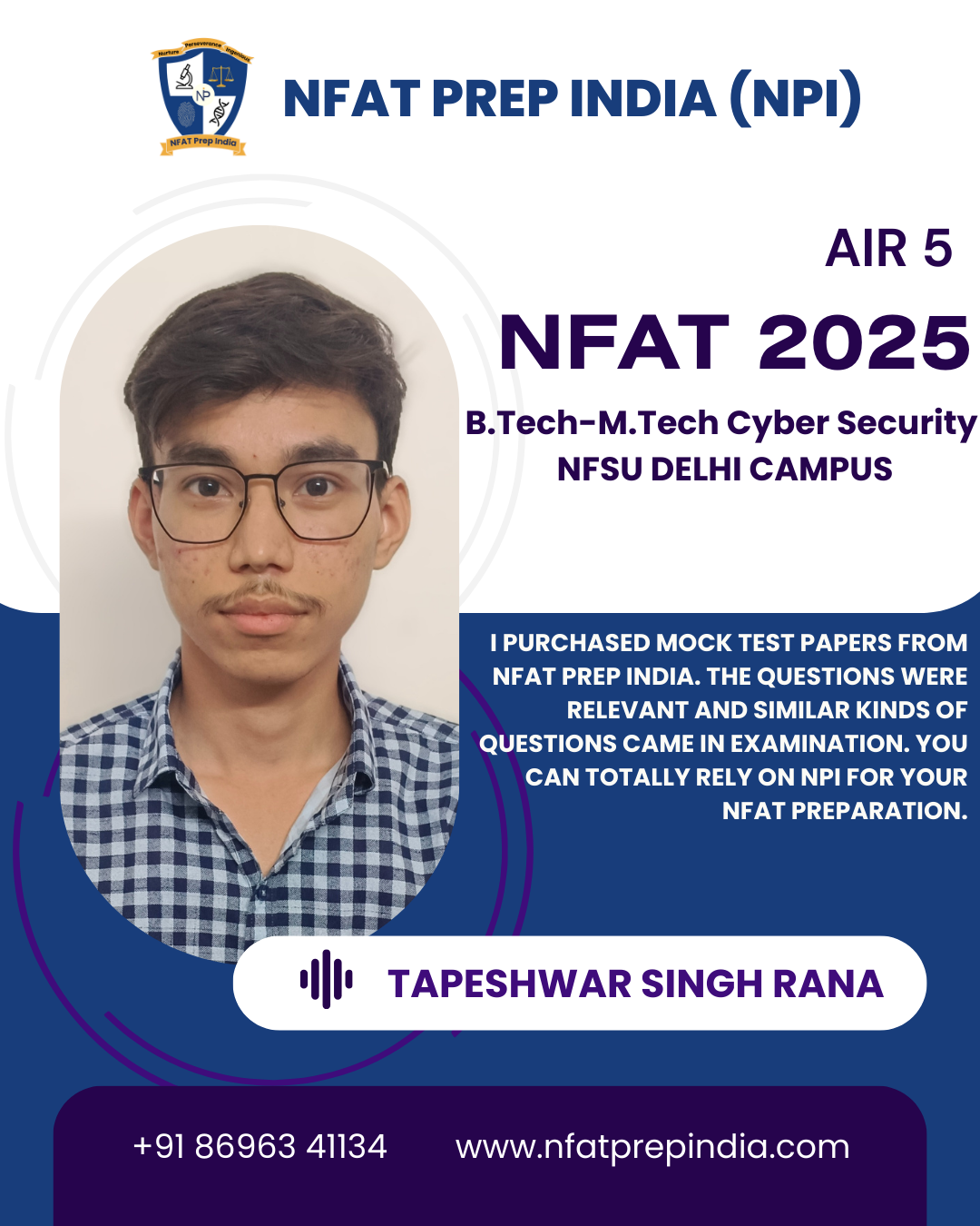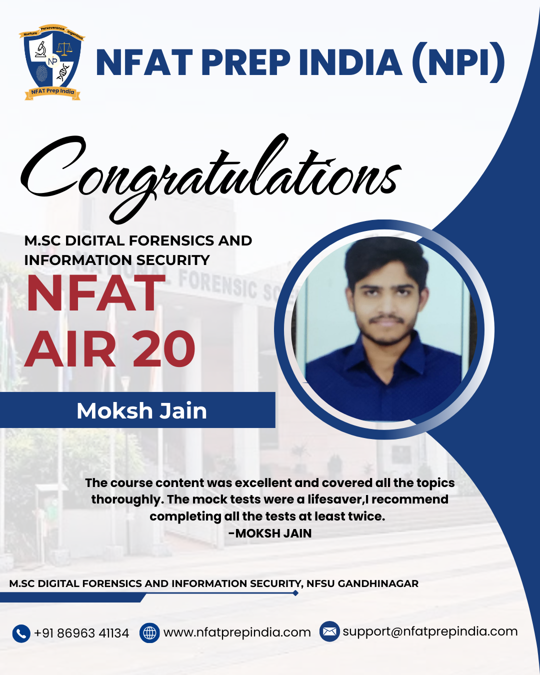 Hear from our students who have cracked the NFAT exam with the help of NFAT Prep India (NPI). Their experiences, challenges, and achievements will inspire you to stay focused and achieve your dream college (NFSU). Read their testimonials and see how our Mentorship Program, Mock Tests, and Expert Guidance have made a difference in their journey!Â
