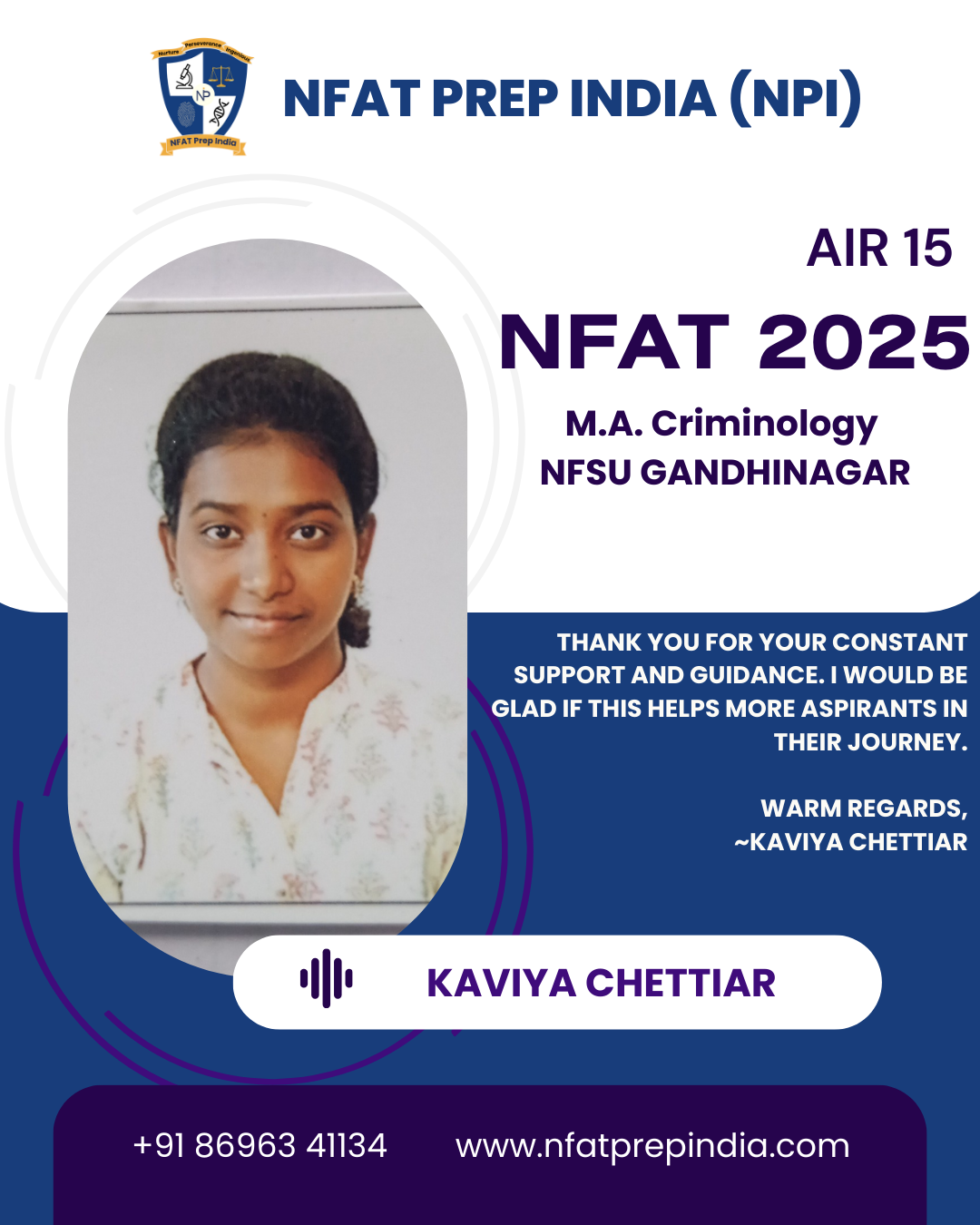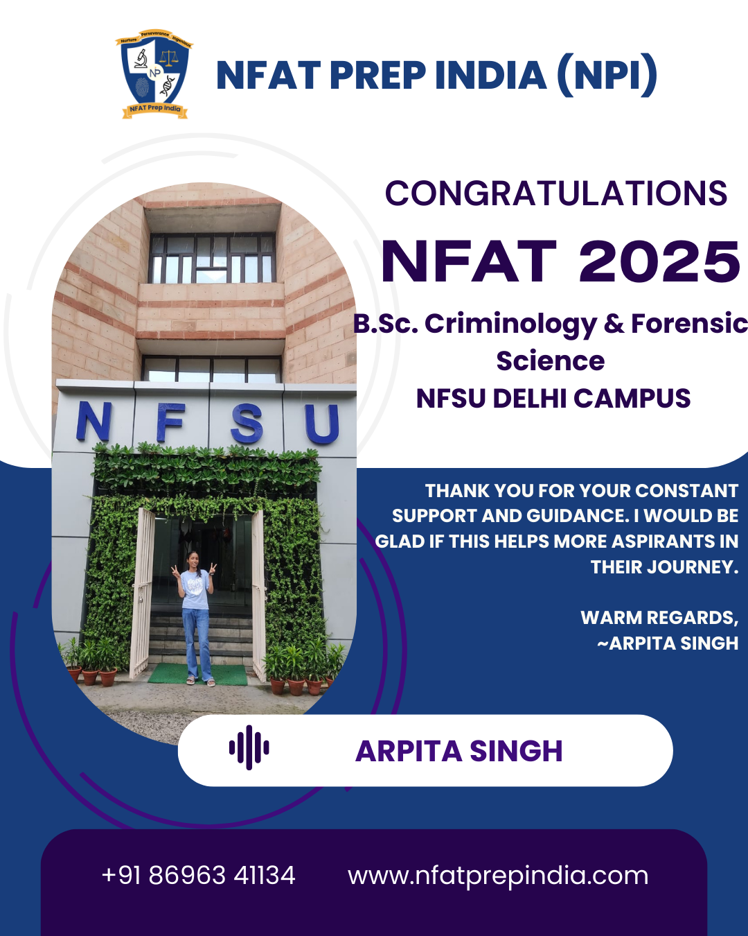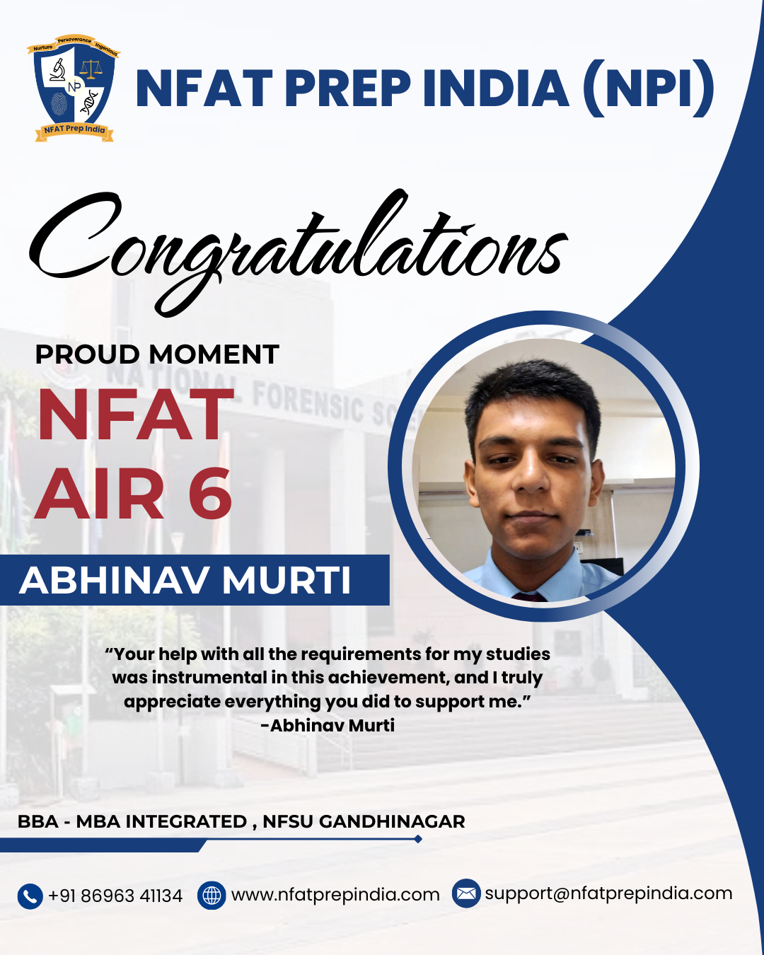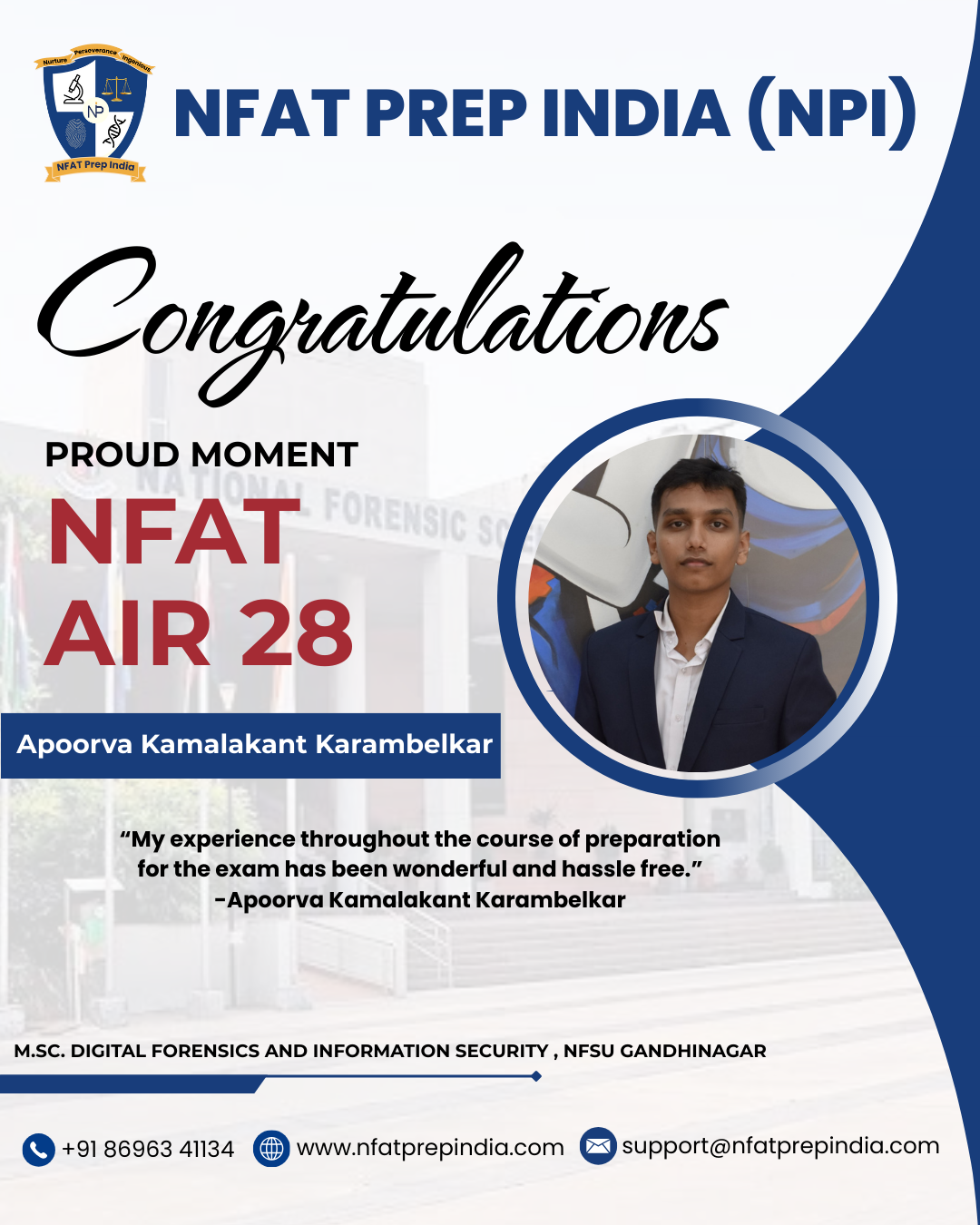 Hear from our students who have cracked the NFAT exam with the help of NFAT Prep India (NPI). Their experiences, challenges, and achievements will inspire you to stay focused and achieve your dream college (NFSU). Read their testimonials and see how our Mentorship Program, Mock Tests, and Expert Guidance have made a difference in their journey!Â